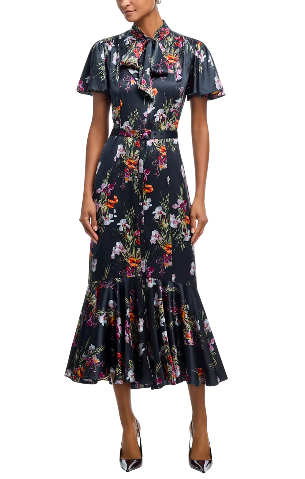 Discover effortless spring elegance with the Iris Bouquet Willow Dress. This midi button-up features a romantic light floral print, refined collared neckline adorned with a delicate bow, and short cape sleeves that add graceful dimension. The flowy hem creates a flattering, feminine finish perfect for any occasion.