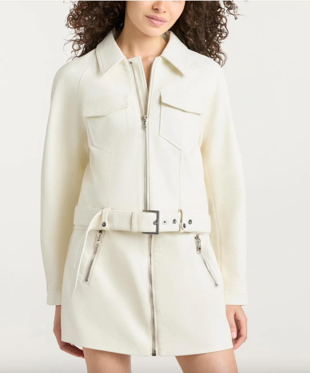 The Saffira Jacket is a collared style with a zip-up front and a distinctive belt detail. This modern jacket adds a sleek, refined touch to any outfit, perfect for those seeking a fashionable and versatile layering piece.