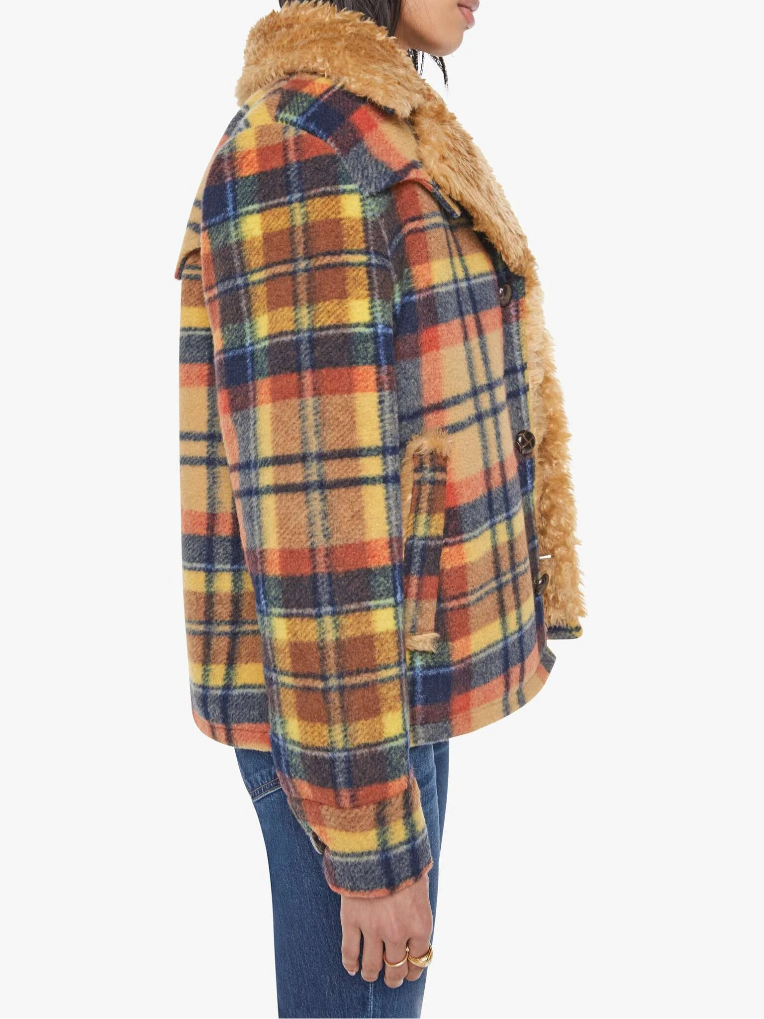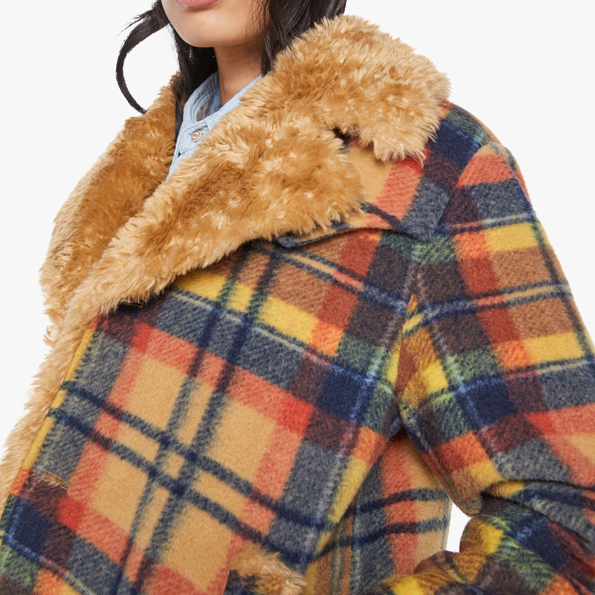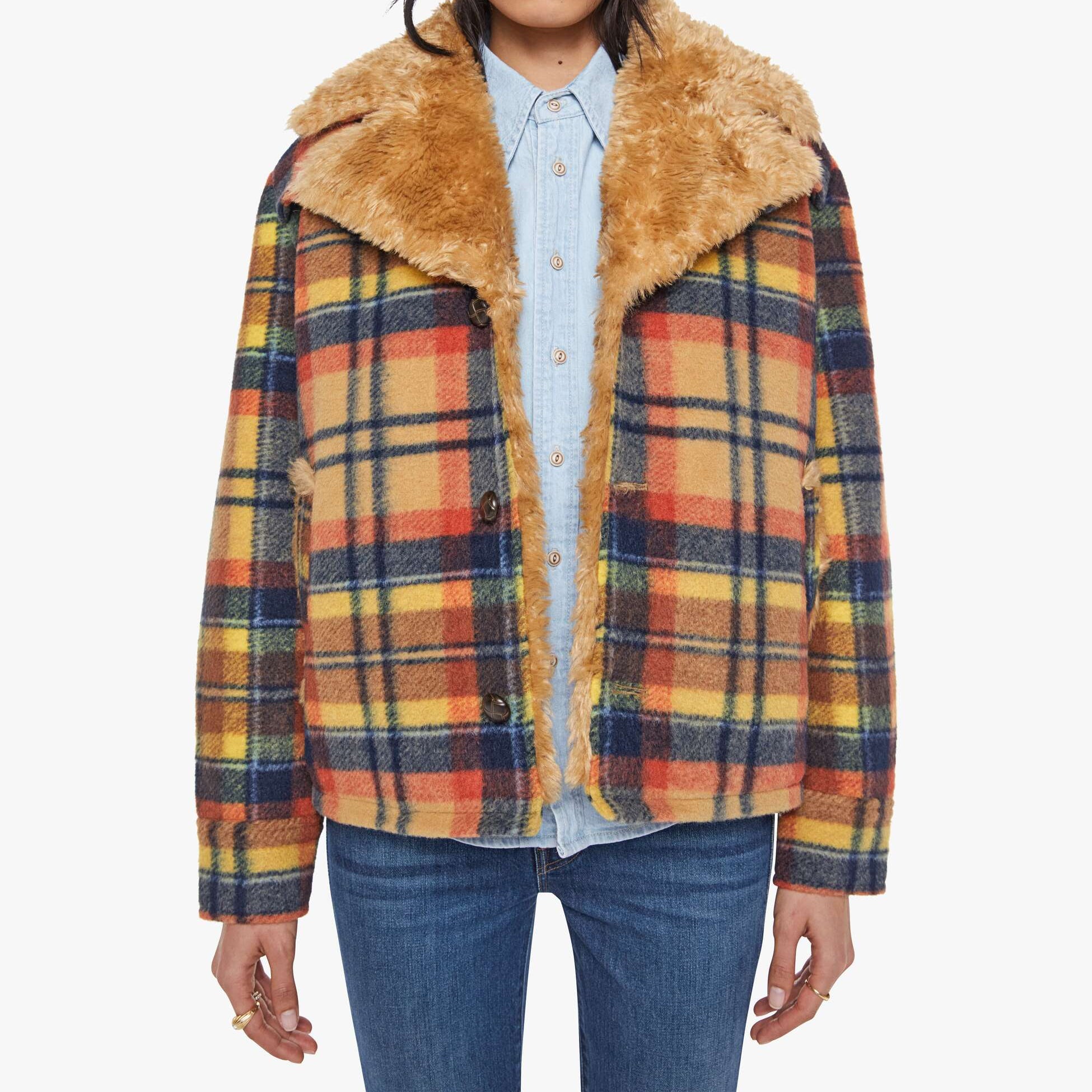 In tune. A boxy jacket with an oversized notched collar, buttons down the front and a loose fit. Designed in yellow, orange and navy plaid, The After School Special in Strike A Chord features faux-fur trim on the collar.