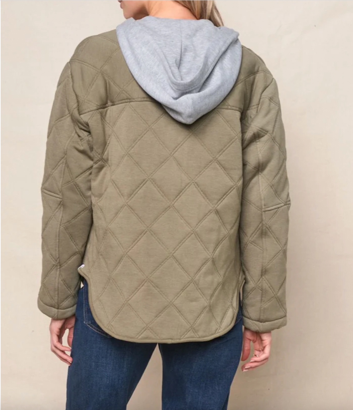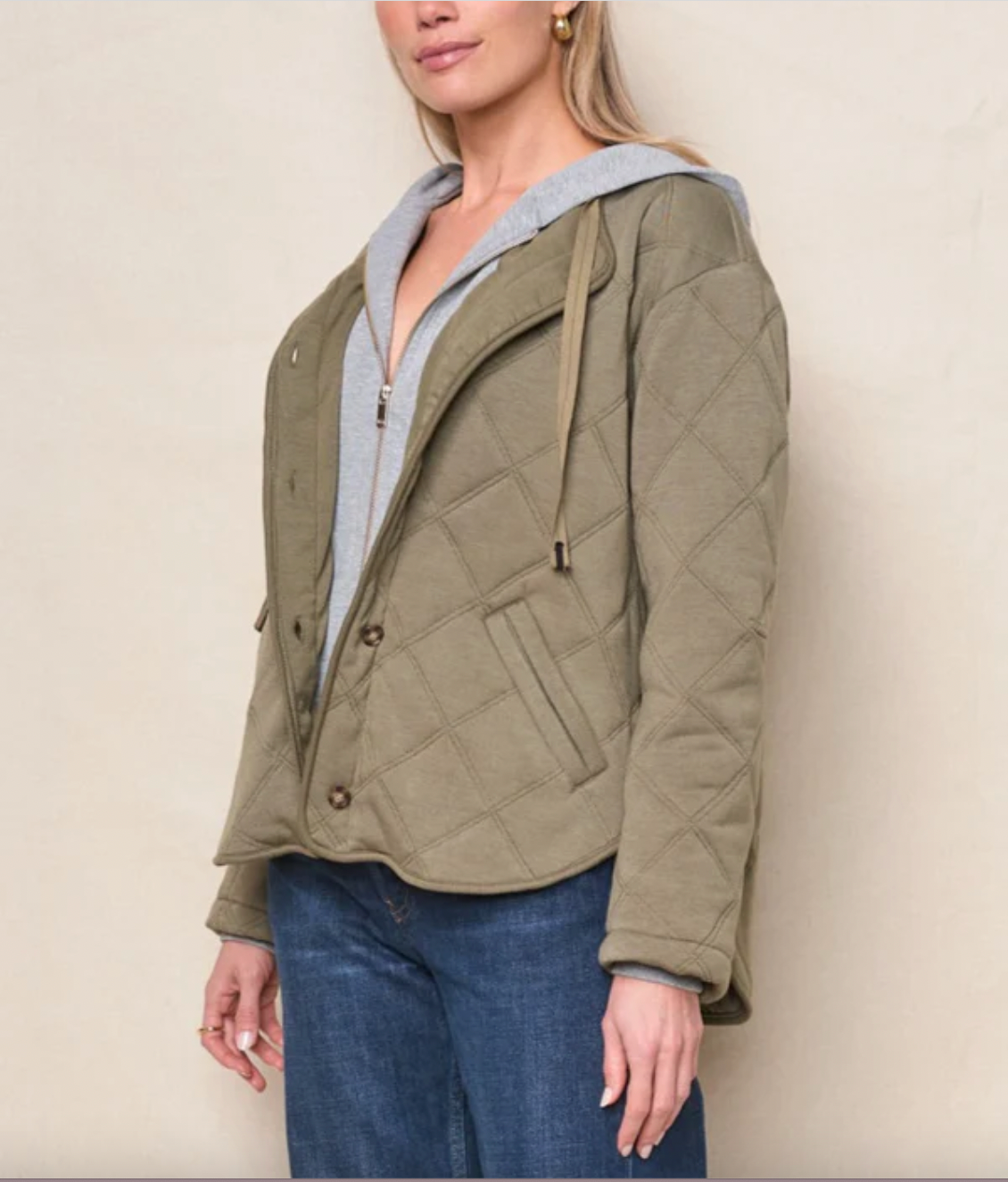 This quilted coat in thyme features a diamond-stitched design with a clean, collarless neckline and tonal snap buttons for a modern utility look. Soft yet structured, it's the perfect lightweight layer for transitional weather.