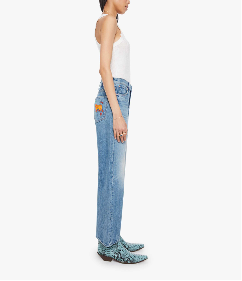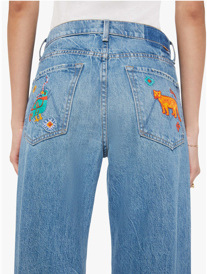 Show's over. Jeans designed to sit on the hips with a slouchy fit, a loose straight leg, zip fly and a 28.25-inch inseam with a clean hem. Cut from rigid SUPERIOR denim, That's All Folks is a mid-blue with whiskering, fading at the knees and embroidery on the back pockets.