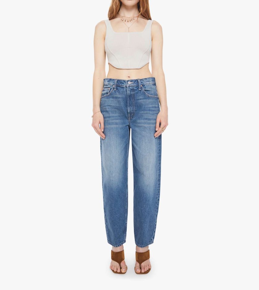 A blast from the past. Super high-waisted barrel-leg jeans with a zip fly, ankle-length inseam and a clean hem. Made from rigid SUPERIOR denim, Remember When is a mid-blue with whiskering and fading at the knees.