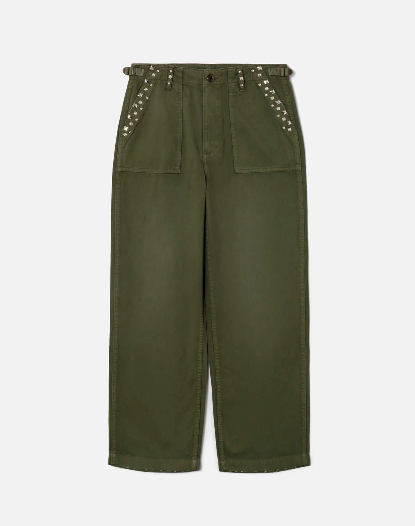 The Trooper Pant is crafted in brushed twill with a vintage military silhoutte, a designed covertible fit that can be cinched high at the waist or worn low for effortless comfort. Features vintage inspired fatigue wash on comfort stretch twill,pytamid studs to accent, classic zipper fly and finished hem.