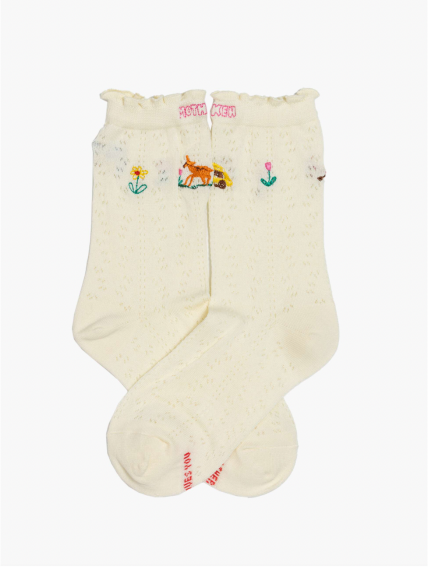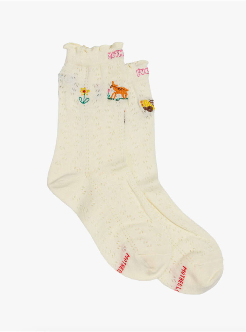 From cab to cabin. Tube socks with a message from MOTHER. Shown here in white with colorful embroidery throughout.