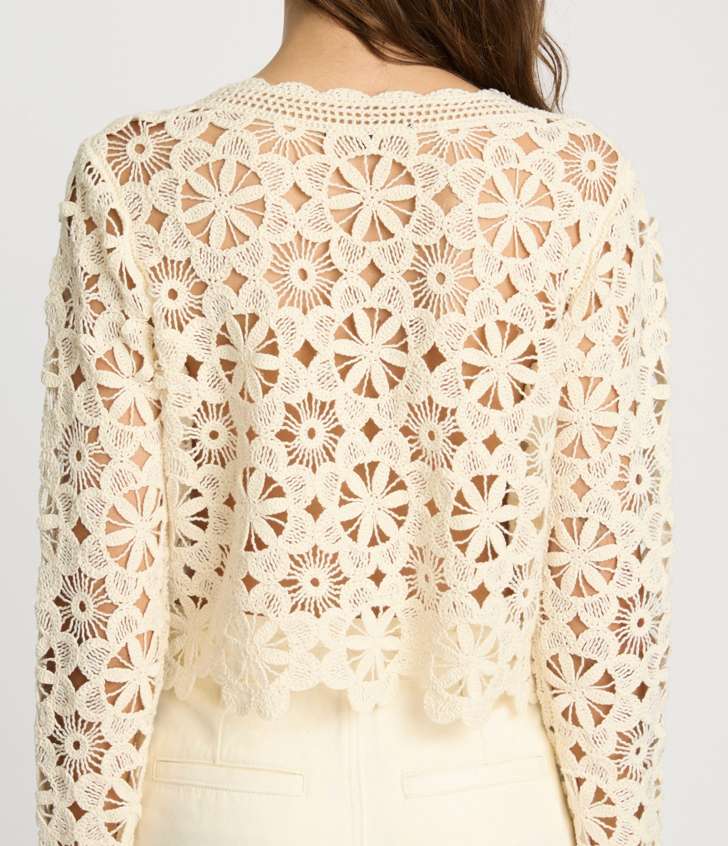 The Corina Sweater in cream is a statement layering piece crafted with intricate floral crochet detailing throughout. Designed with a lightweight, open-knit construction, it features long sleeves and a softly cropped silhouette that feels both feminine and modern. A delicate button-front placket adds vintage-inspired charm, while scalloped edges lend a refined finish.