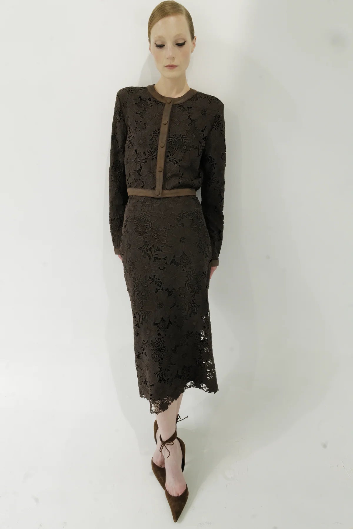 The Didier Set is the ultimate expression of subtle, textured luxury. Crafted from a magnificent, dark brown embroidered lace, this ensemble redefines elegance by pairing an unexpected fabric with structured silhouettes. Worn together, the Didier Set offers a sophisticated, monochromatic statement that is effortlessly chic.