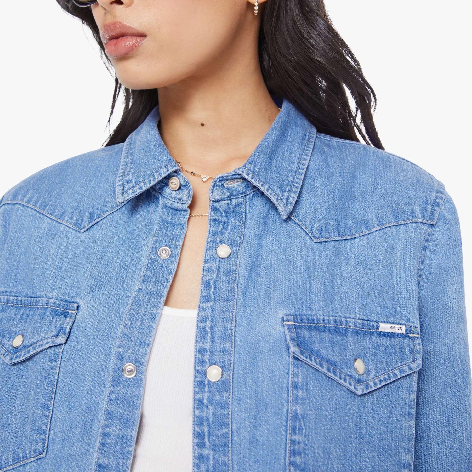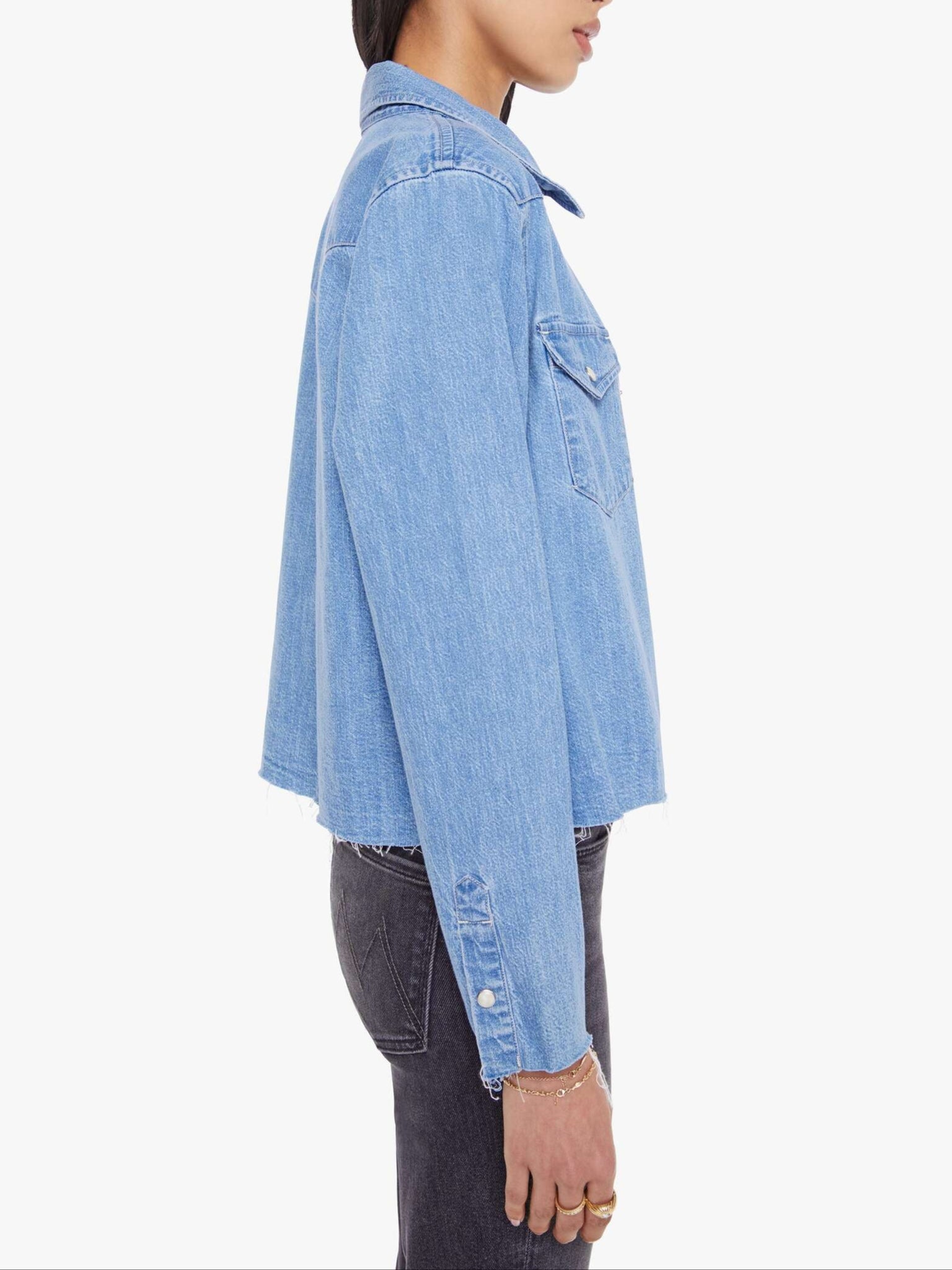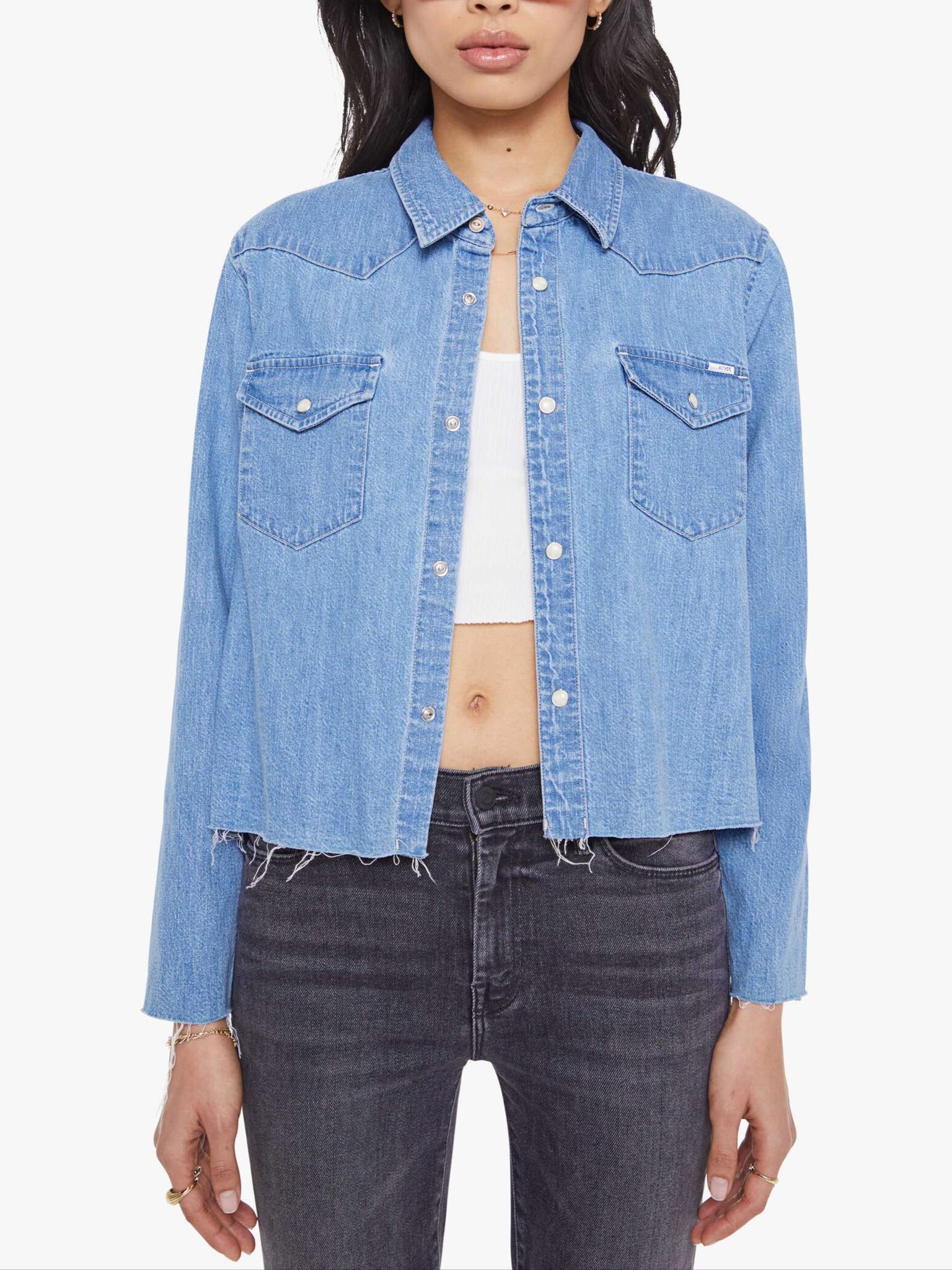 Yours for the taking. A Western-inspired denim button-up with front patch pockets and a cropped, raw hem. The Super Exes Crop Step Fray is made from 100% cotton, Playing For Keeps is a faded vintage-blue with faux pearl snaps down the front.